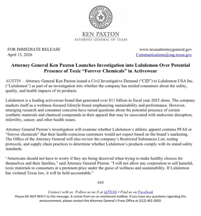 美国时间4月13日,美国得克萨斯州总检察长Ken Paxton在社交平台X上发文称,已对Lululemon美国公司发布调查令,原因是其运动服饰中可能含有PFAS(全氟及多氟烷基物质)。