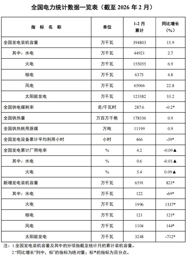 中新网3月25日电 据国家能源局微信公众号消息,3月25日,国家能源局发布2026年1-2月份全国电力统计数据。