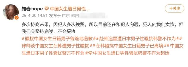 4月20日,当事人“知春hope”再次发声,称与日籍男子进行过多次民事调解,但暂未达成一致。她告诉媒体,事发后一直滞留在韩国处理维权相关事宜。涉事日籍男子已于4月19日重新入境韩国釜山。由于该事件同时涉及民事侵权与刑事违法,双方于19日当晚先行开展民事调解。